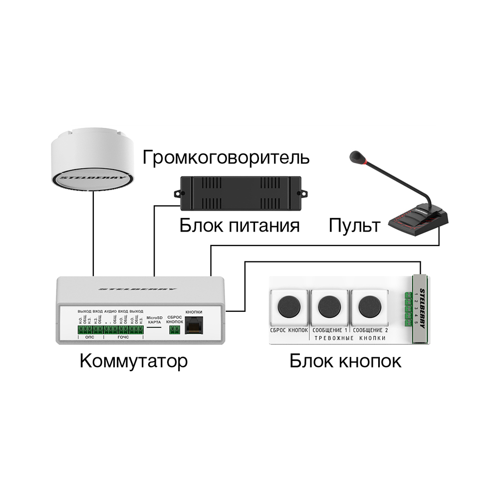 Демокомплект позволяет оперативно продемонстрировать клиенту все возможности системы громкого оповещения Антитеррор. Все компоненты системы оповещения STELBERRY Антитеррор уже подключены между собой в демокейсе.