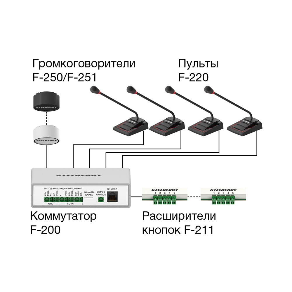 Центральным компонентом системы Антитеррор является коммутатор STELBERRY F-200, к которому можно подключить необходимое оборудование: