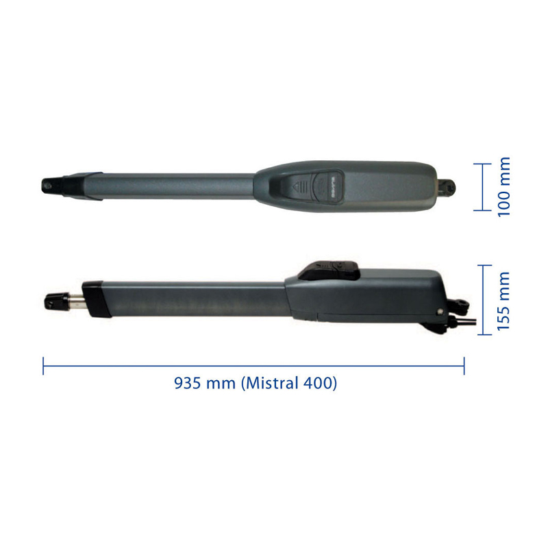 Электромеханический привод линейного типа Mistral LS 400 исполнено в виде навесного активатора. Обеспечивает управление воротами, путём изменений в линейных размерах активирующего штока привода распашных ворот. Приводы линейного типа наиболее подходящий, для распашного типа ворот.