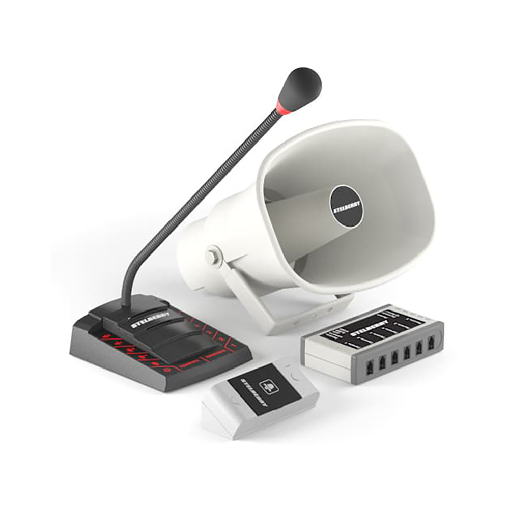 Комплект 6+1-канального переговорного устройства клиент-кассир для АЗС с системой громкого оповещения, функцией "симплекс", функцией "вызов", встроенным усилителем, рупором на 15 Ватт и выходом для записи переговоров. Рупор идёт в комплекте с 15 метрами кабеля. Панель клиента, угловое крепление панели и блоки питания в комплекте.