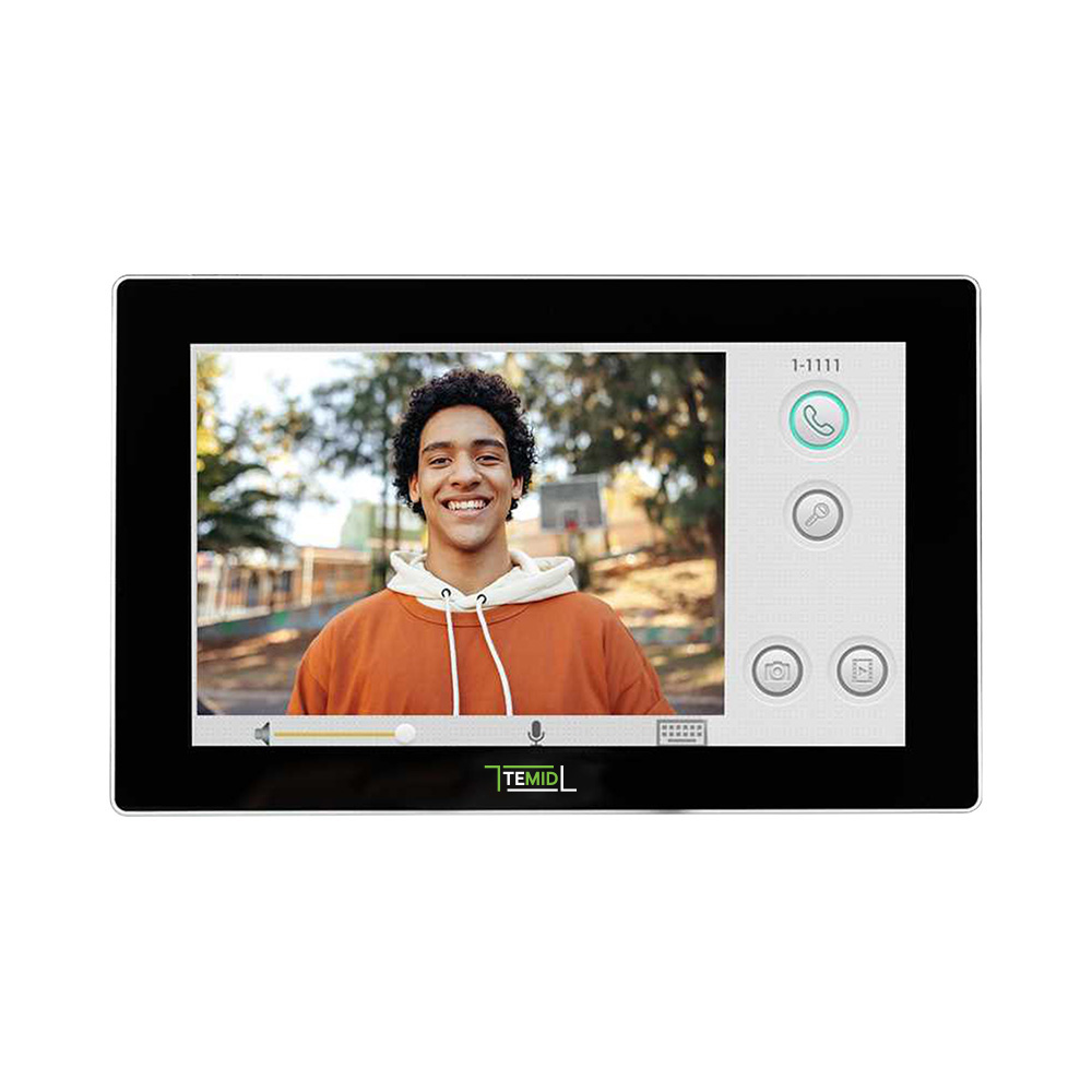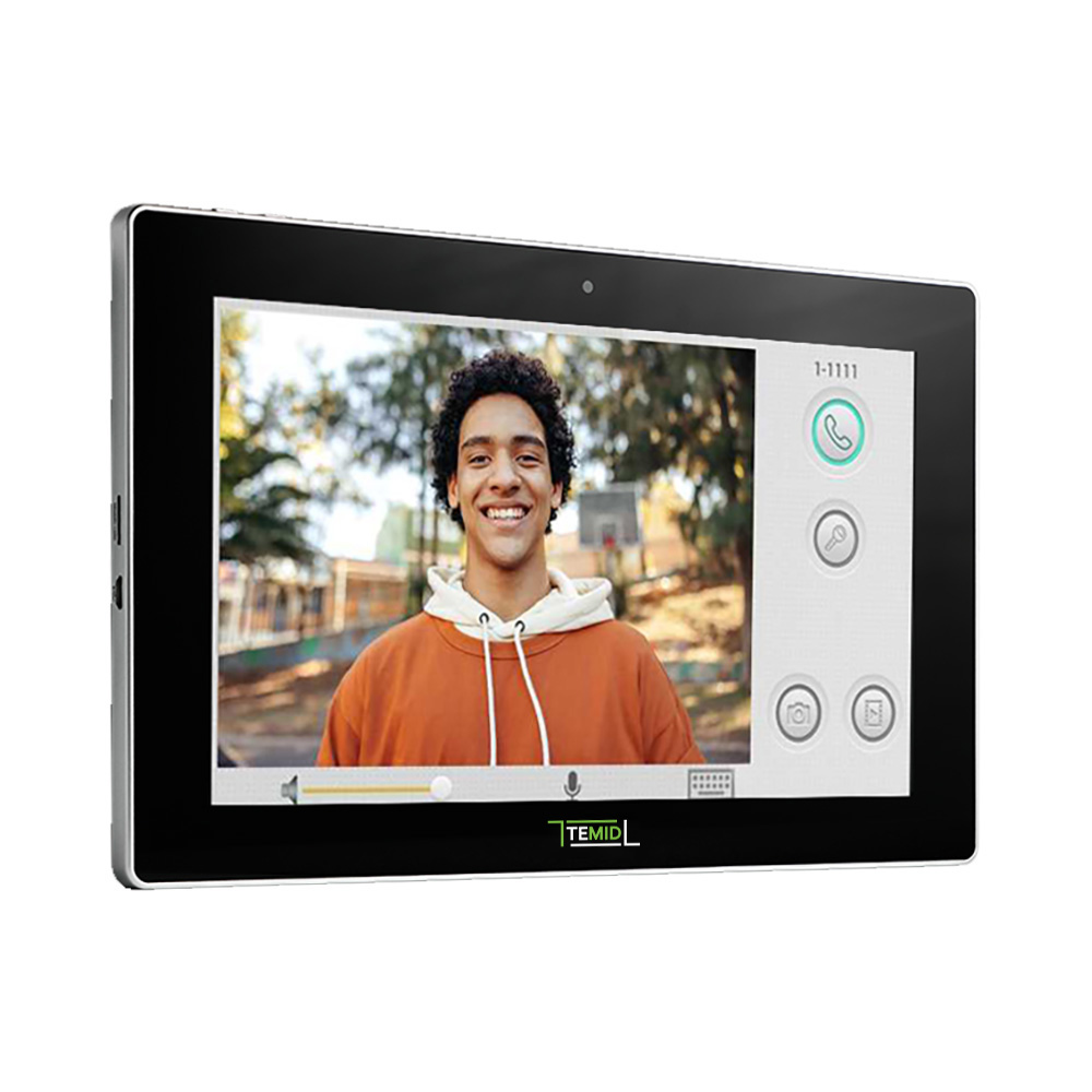 IP видеодомофон с сенсорным экраном 10". Система: Linux. Разрешение: 1024×600. Просмотр до 8 камер. Поддержка 8 зон датчиков: дым, газ, PIR, дверь, окно, паника и затопление. Питание: PoE и + 12 В. Поддержка SIP 2.0. Управление разблокировкой двери и интеграция с системой управления лифтом.