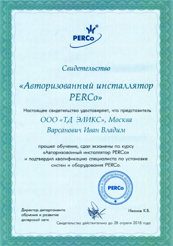 Наши сотрудники Варсанович Иван Владимирович и Манягин Сергей Юрьевич прошли обучение в PERCo и успешно сдали квалификационные экзамены по программе «Авторизованный инсталлятор».