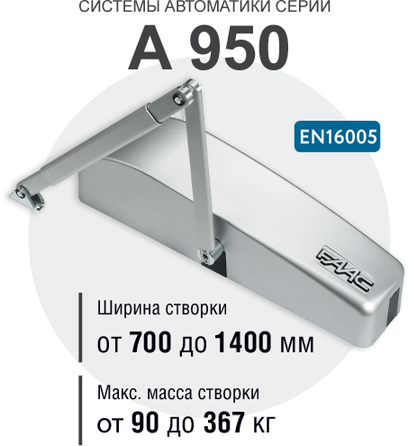 - Можно безопасно управлять дверями шириной от 700 до 1400 мм и массой до 367 кг.